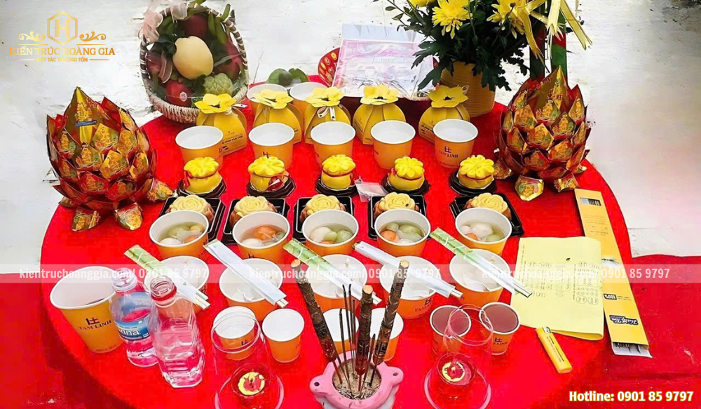 - Mâm lễ cúng khởi công gồm xôi chè, bánh kẹo, ngũ quả, muối – gạo – nước, hoa tươi, nhang đèn... tất cả được sắp đặt ngay ngắn, thể hiện sự trang nghiêm và lòng thành.