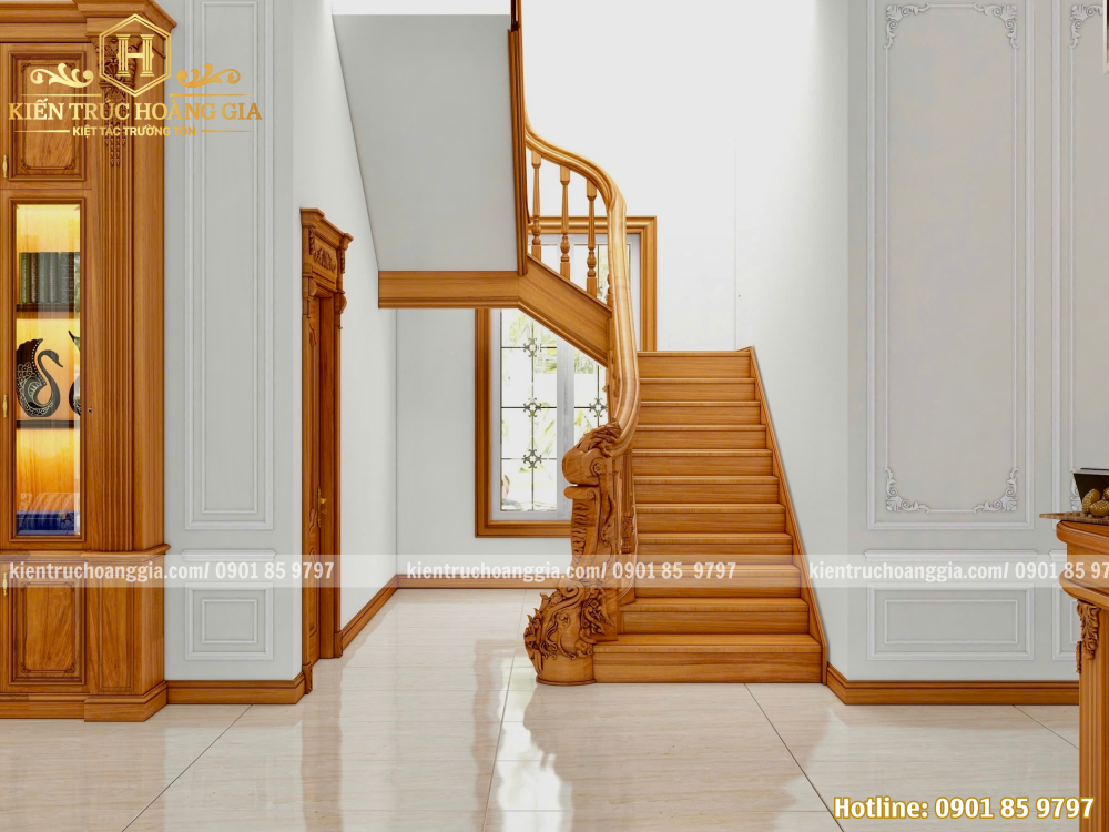 Cầu thang gỗ gõ đỏ vừa chạm khắc tinh xảo mang lại yếu tối trang trí độc đáo ngoài ra chắc chắn, an toàn, vừa là yếu tố trang trí độc đáo: