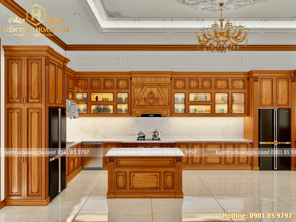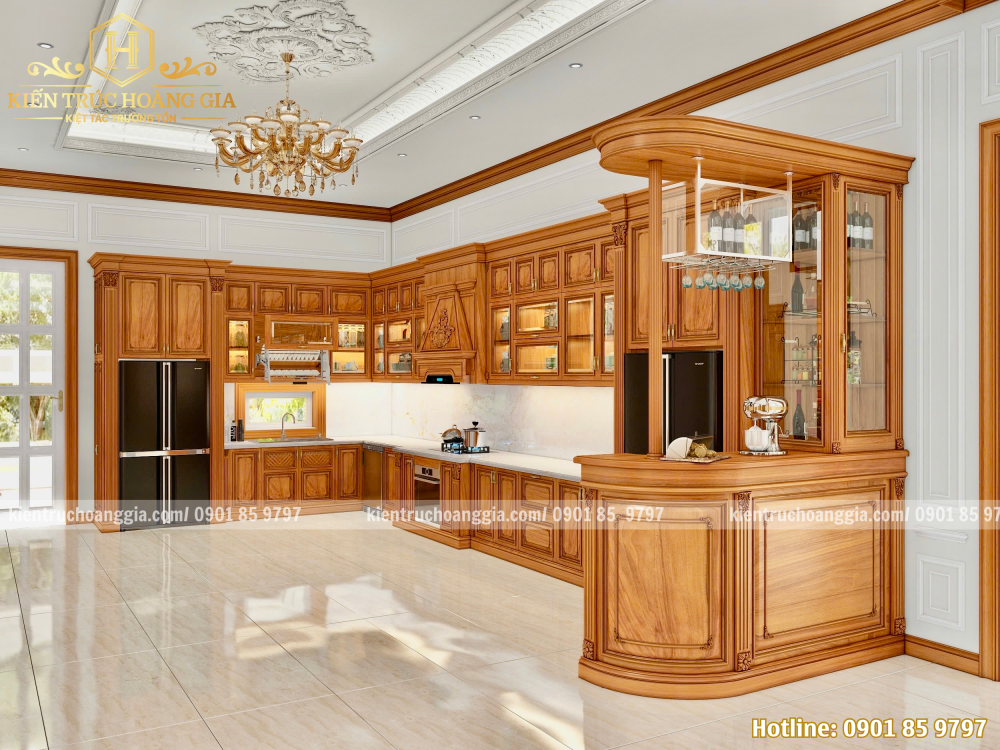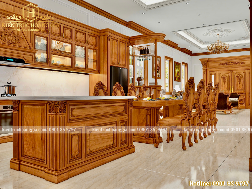 Bếp không chỉ là nơi nấu nướng mà còn là không gian gắn kết gia đình. Nội thất gỗ gõ đỏ trong bếp gồm: