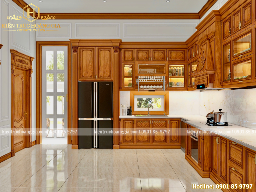 Tủ bếp: gỗ gõ đỏ bền chắc, chống ẩm mốc, dễ vệ sinh.